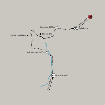 6. Azib N’Asdrem–Ouled Berhil. Descente de la vallée de Timighad jusqu’au Souk El Khemiss. Arrivée vers midi pour le pique-nique. Départ en 4x4 (4 heures) par la route de Taliwine jusqu’à Ouled Berhil. Nuit et repas du soir au riad.